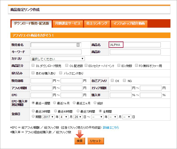 商品指定リンク作成画面が表示されますので、「商品名」に「ALPHA」と入力して検索してください。
