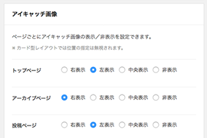 トップページ、アーカイブページ、投稿ページ、固定ページのそれぞれで、アイキャッチ画像の表示/非表示、およびその位置(右、左、中央)を指定できます。
