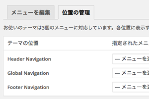 カスタムメニュー対応に対応しています。ページ最上部、タイトルとコンテンツの間のグローバルメニュー、ページ最下部のコピーライトの右側にそれぞれ1ヵ所です。