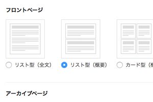 投稿の表示方法をリスト型(全文/概要)、カード型(概要/タイトル)4つから選択できます。それらはトップページとアーカイブで別々に設定できます。